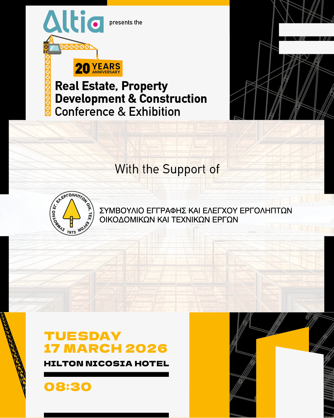 Η IMH διοργανώνει το 20th Property Development & Construction Conference & Exhibition, το οποίο θα πραγματοποιηθεί την Τρίτη, 17 Μαρτίου 2026, στο ξενοδοχείο Hilton Nicosia. Για περισσότερες πληροφορίες σχετικά με το πρόγραμμα του συνεδρίου κάντε κλικ εδώ